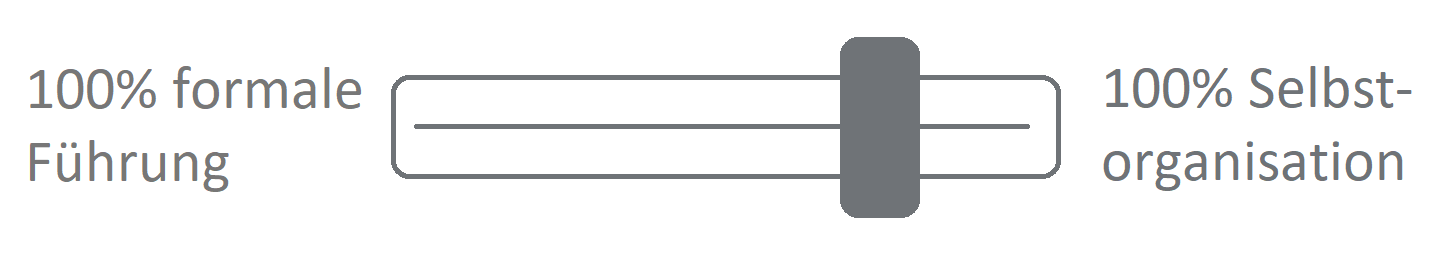 Wir verorten jede Führungskraft, jedes Team und jede Organisation zunächst auf dem Spektrum zwischen 100% formaler Führung und 100 % Selbstorganisation. Anschließend stärken wir die formelle Führung an dem individuellen Punkt.
